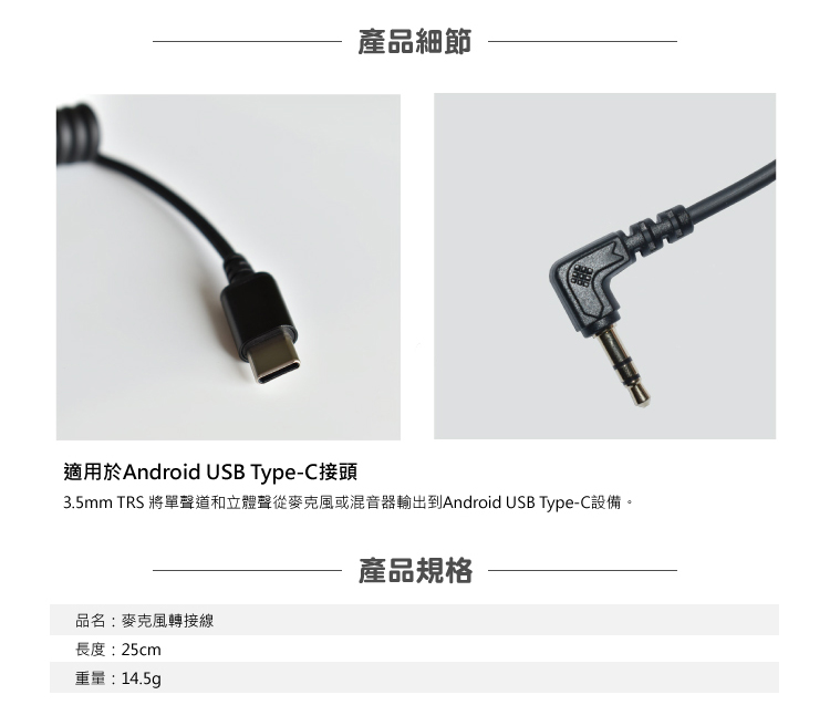 • 3.5mm TRS 將單聲道和立體聲從麥克風或混音器輸出到Android USB Type-C設備