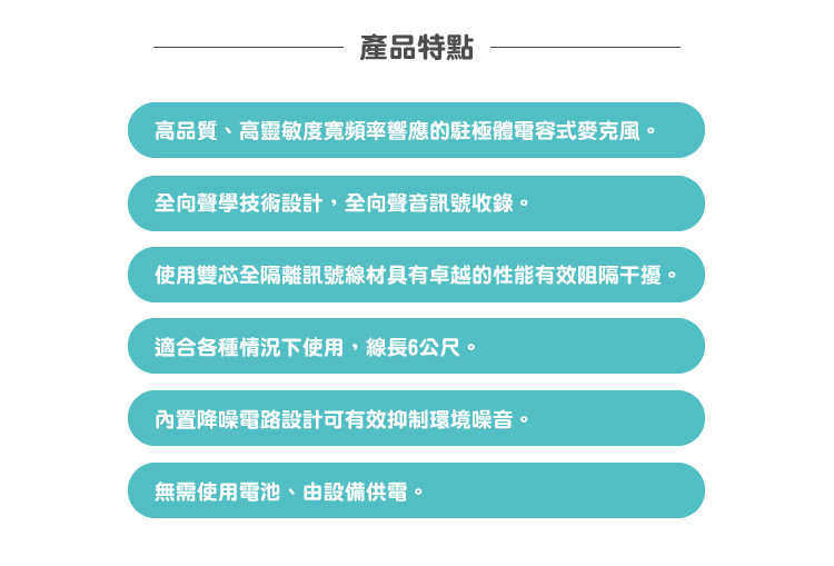 • 高品質、高靈敏度寬頻率響應的駐極體電容式麥克風