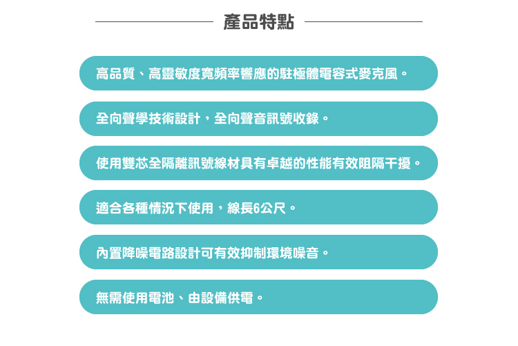 • 高品質、高靈敏度寬頻率響應的駐極體電容式麥克風