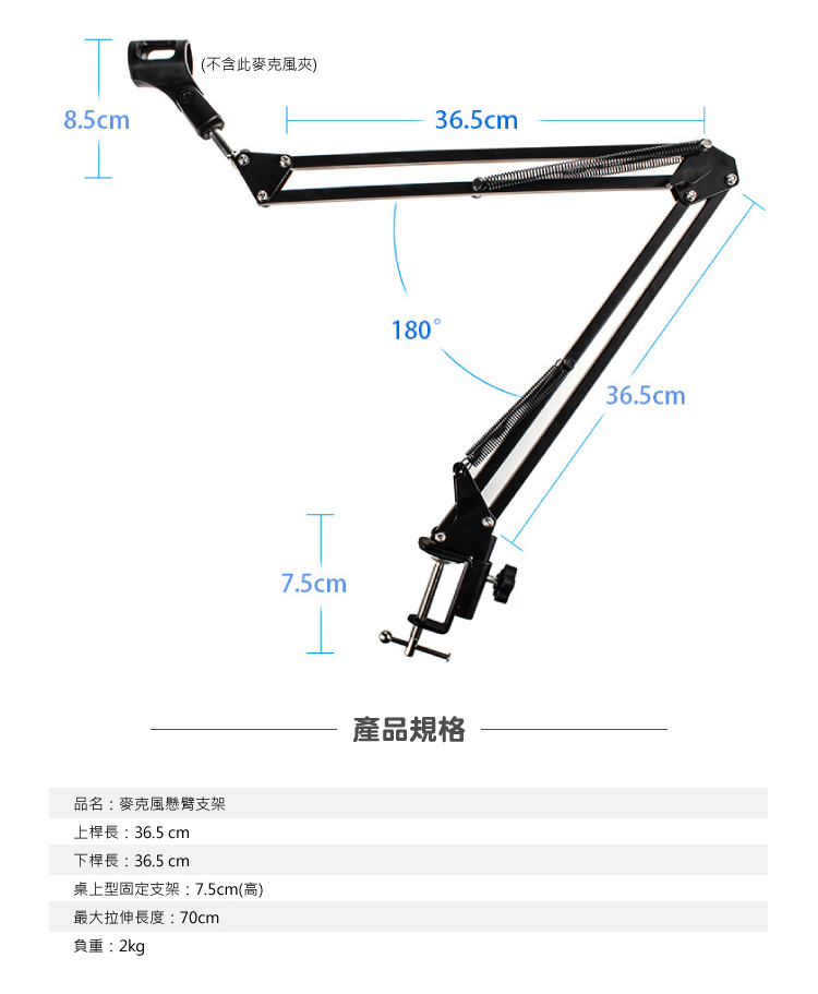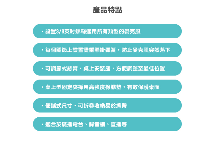 • 每個關節上設置雙重懸掛彈簧,防止麥克風突然落下