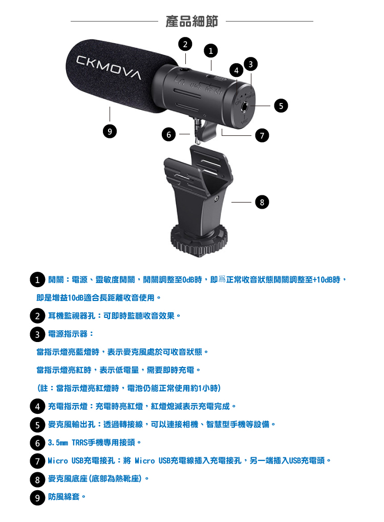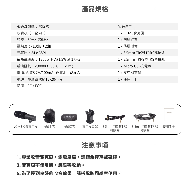 • 附3.5mm TRS轉TRS、TRS轉TRRS轉接線、Micro USB充電線