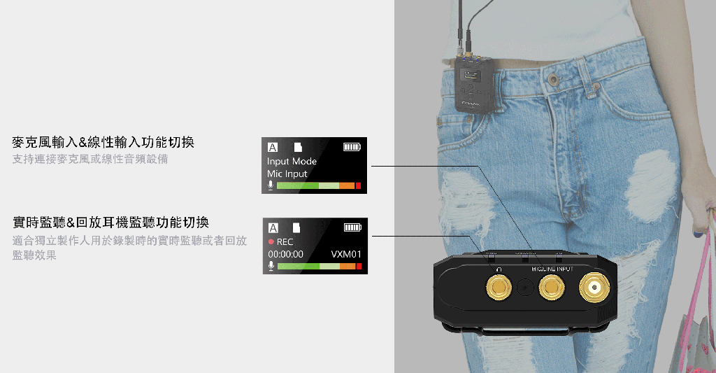 • 依據聲軌顏色調節錄音距離和聲音大~小(紅~綠)